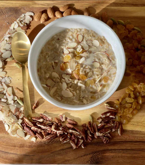 - Garnish : sliced almonds, pecans, raisins and a teaspoon of turbinado sugar