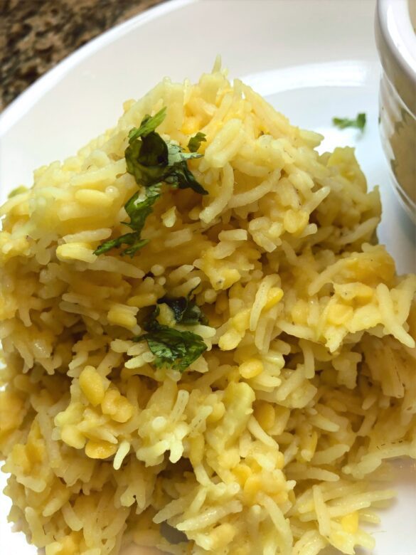 - 1/2 cup of basmati rice mixed in with 1 cup of yellow and red split pea lentil mixed together with the rice (you can try any two lentils you like); see note