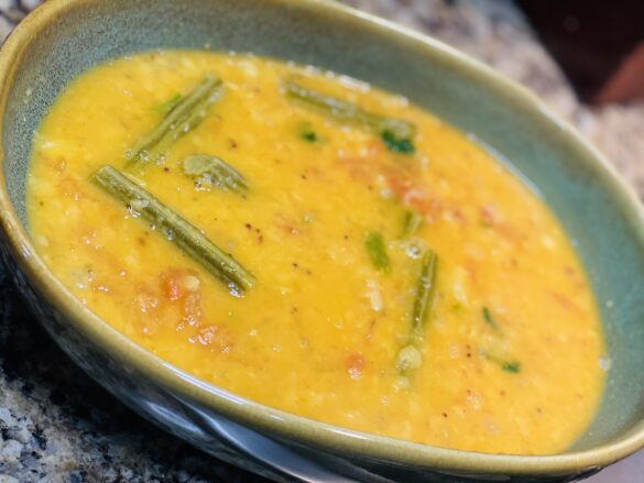 This is one of those Daal’s that you can’t stop eating. This daal recipe is made with Toor Daal (lentil soup). It is high in fiber and protein. Moringa drumsticks add more protein to the equation and taste. It is a very simple method of making daal in a pressure cooker, also can make it in a regular pot just add 20-25 extra minutes of cooking time. Let’s dig into my childhood with this recipe. I loved it then and I love it now.