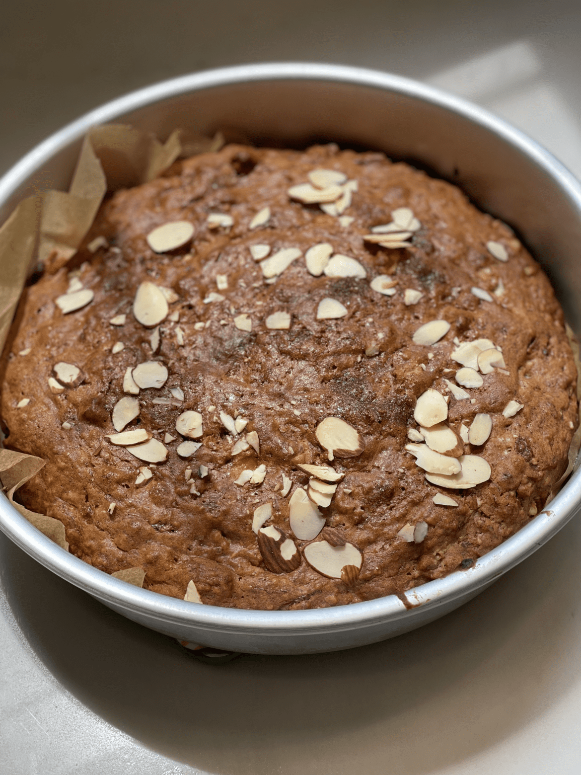 - Assemble the cake mix on the pan and garnish it with brown sugar and sliced almonds.
