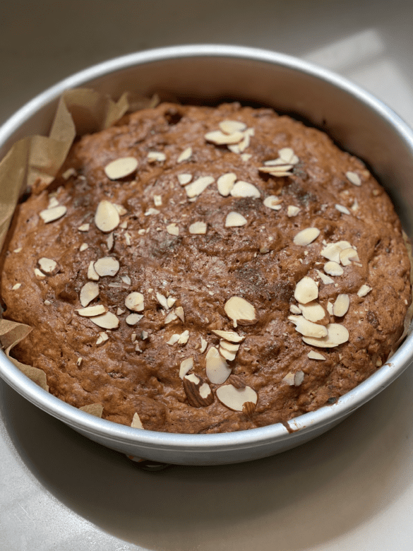 5. Assemble the cake mix on the pan and garnish it with brown sugar and sliced almonds.