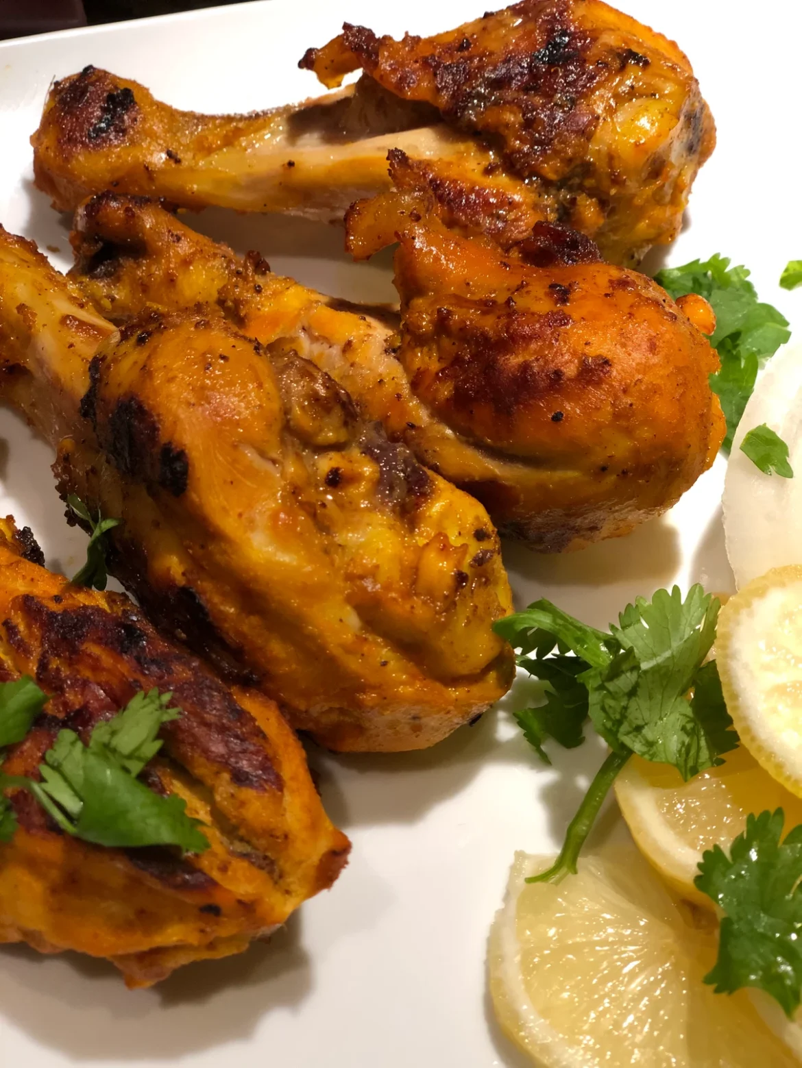 - Marinate the chicken drumsticks in olive oil, salt, black pepper, turmeric, red chilly powder, curry powder, garam masala, orange food coloring, ginger garlic, cilantro paste, and yogurt. Set aside for about 30 mins or an hour.