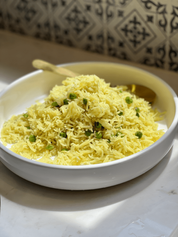 - Turn the flame low after 56 mins and then add in the sweet peas to the rice, by adding the pea later it holds the fresh green color of the peas without over cooking them. Cover and cook on low flame for about another 6-7 mins or Until the rice is cooked grainy and fluffy.